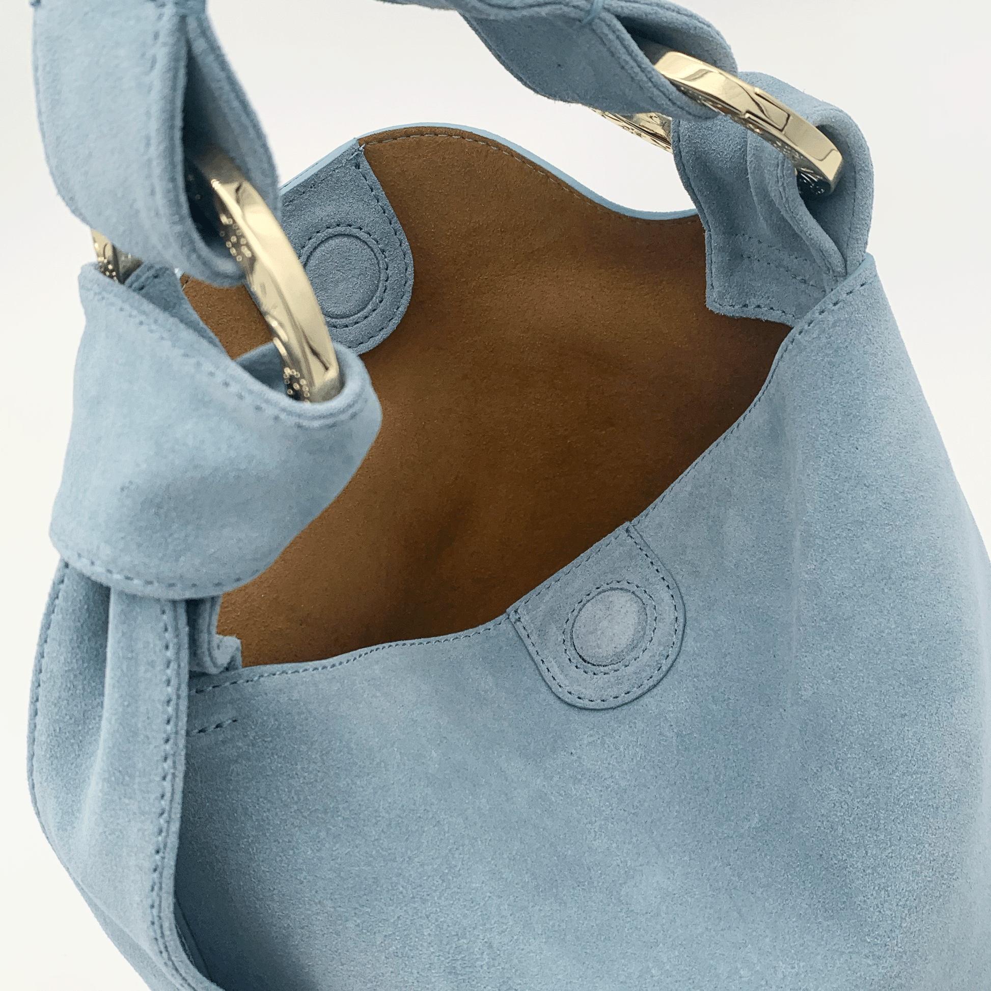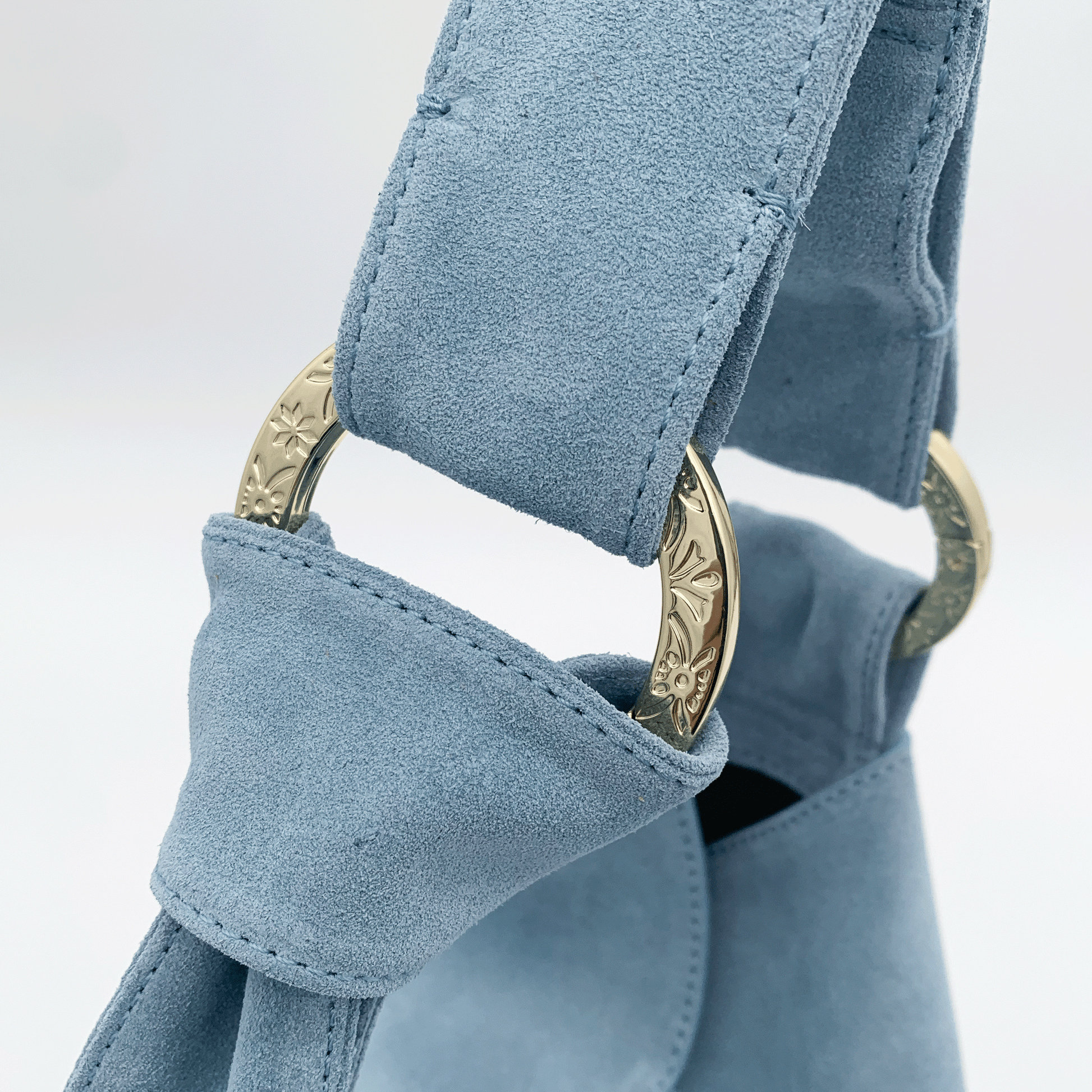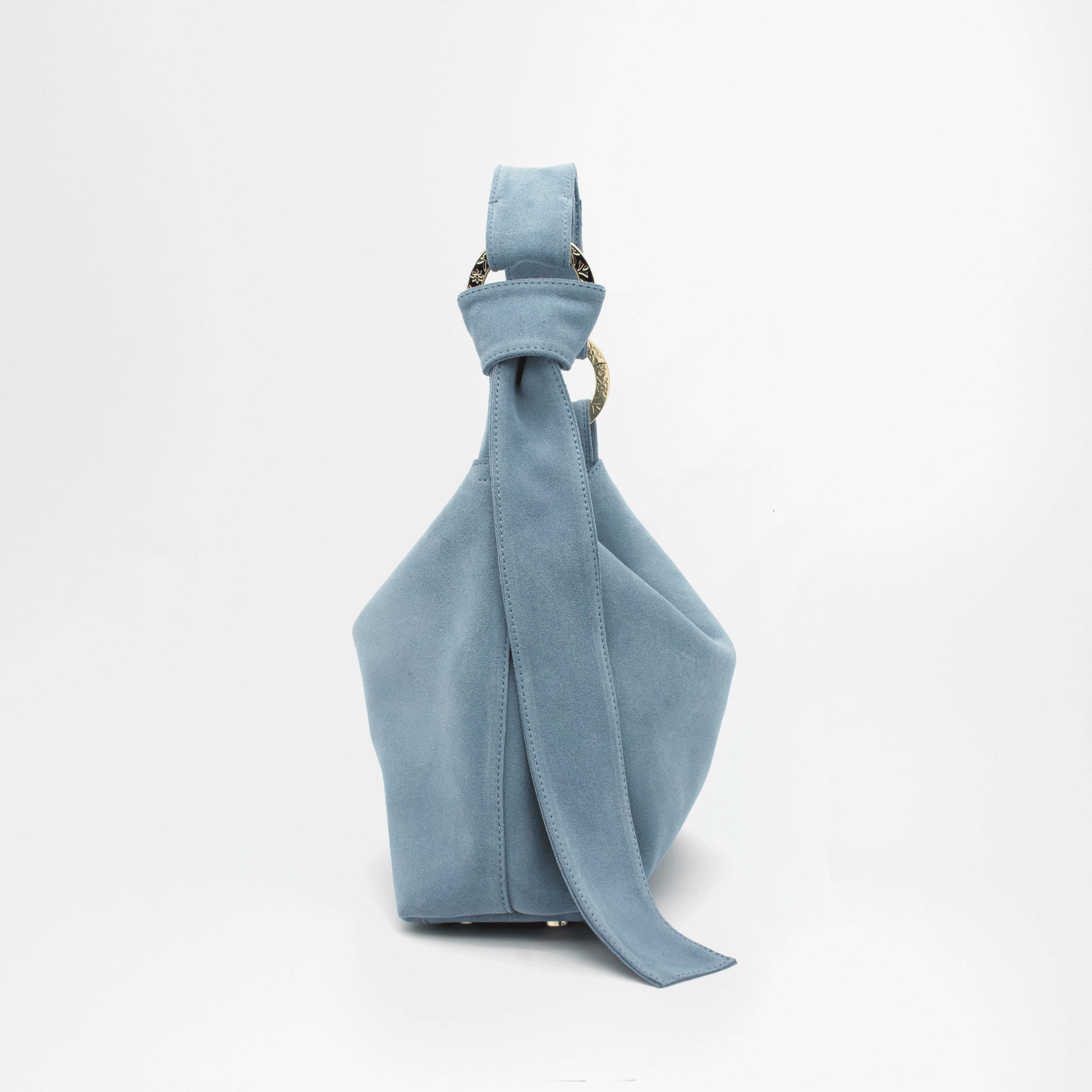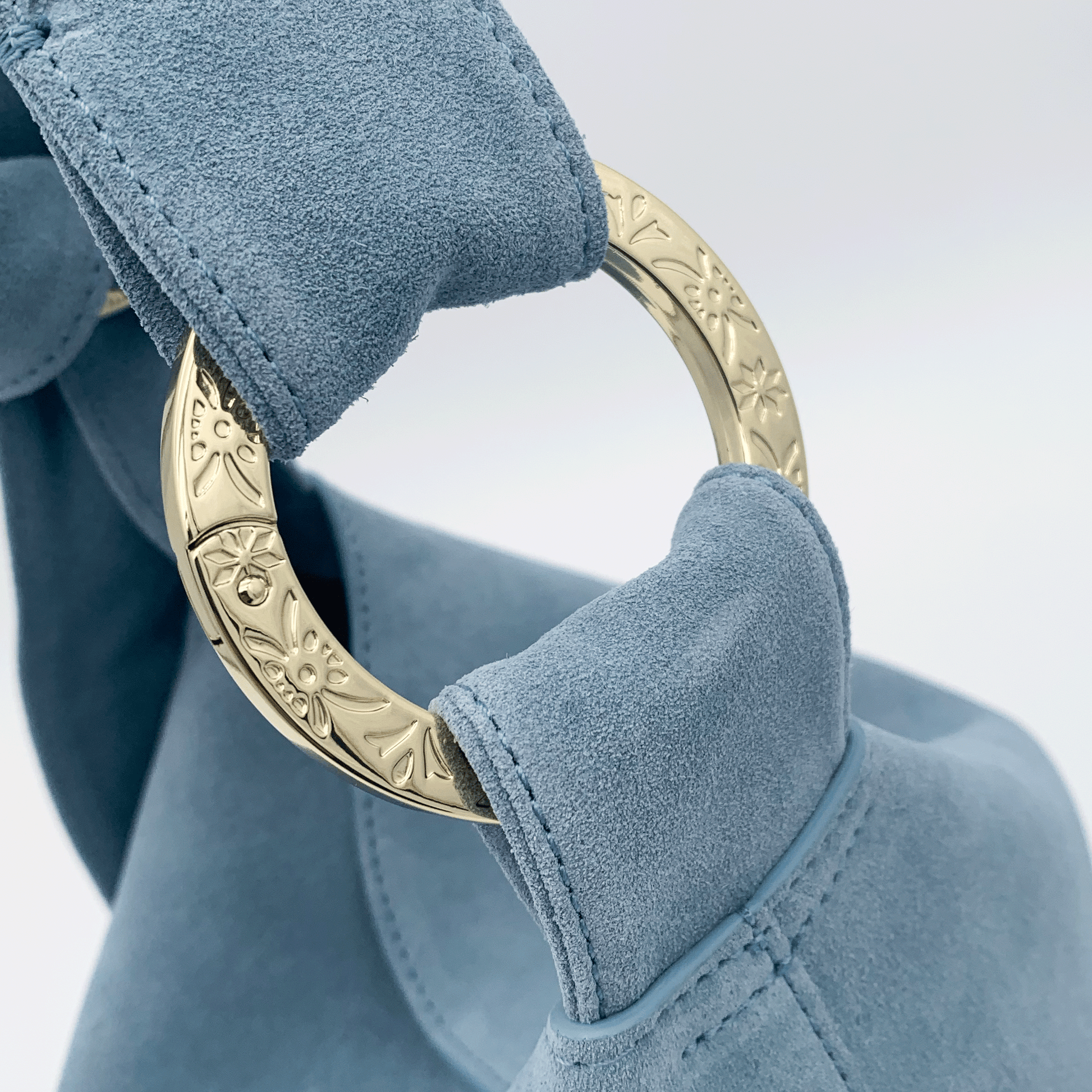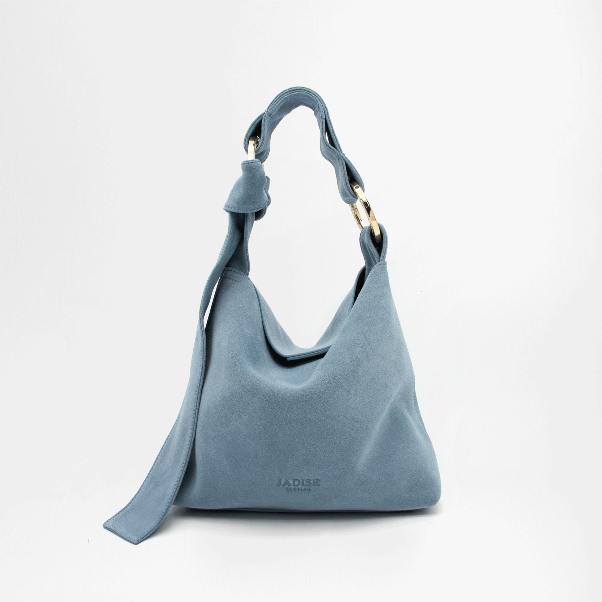 La borsa BEA è l’accessorio ideale per un look casual chic, capace di unire design contemporaneo e dettagli artigianali. Realizzata in morbida pelle scamosciata, doppiata per garantire struttura e leggerezza, si distingue per l’originale manico con nodo regolabile, agganciato tramite due moschettoni tondi personalizzati Jadise, impreziositi da incisioni ispirate ai tradizionali ghirigori siciliani.