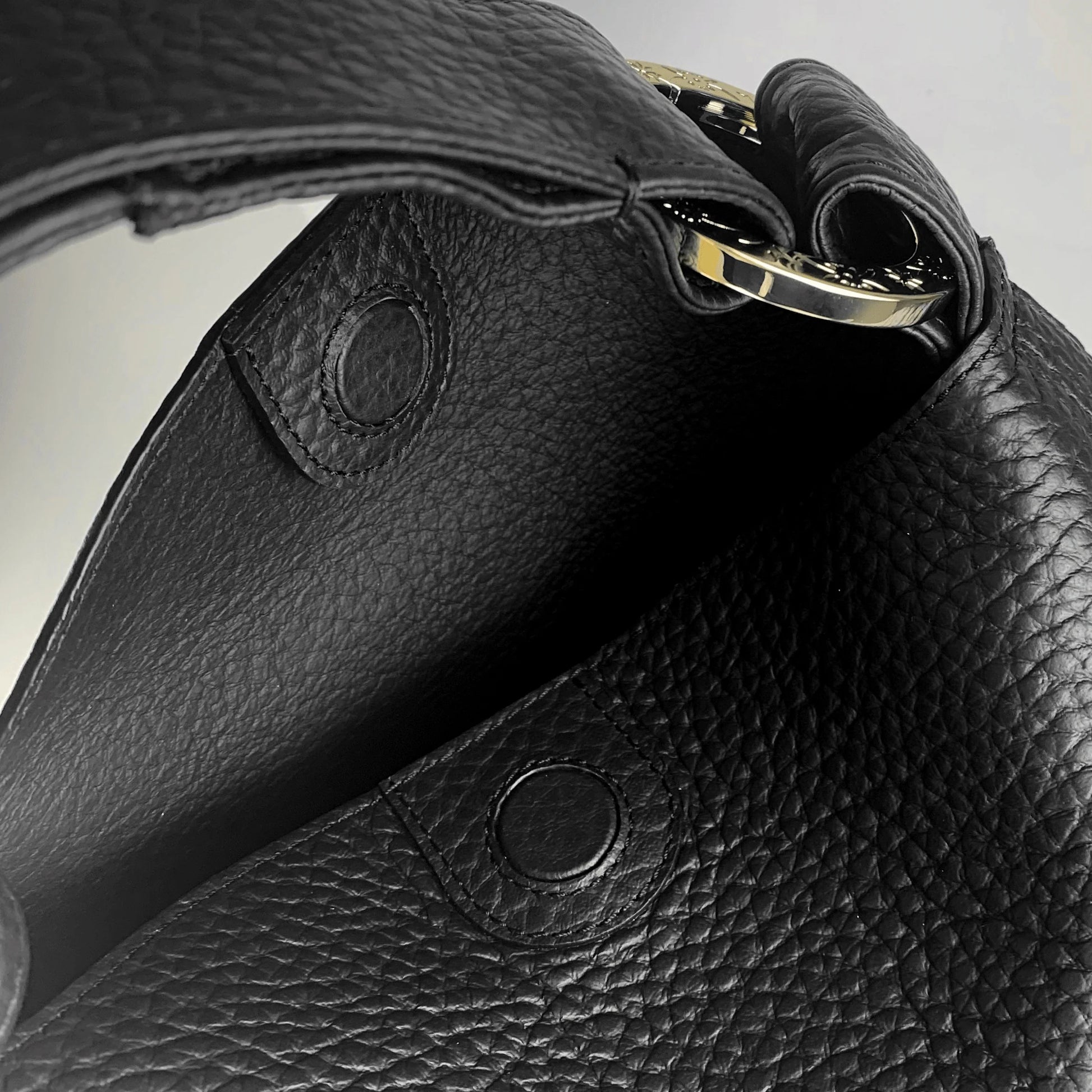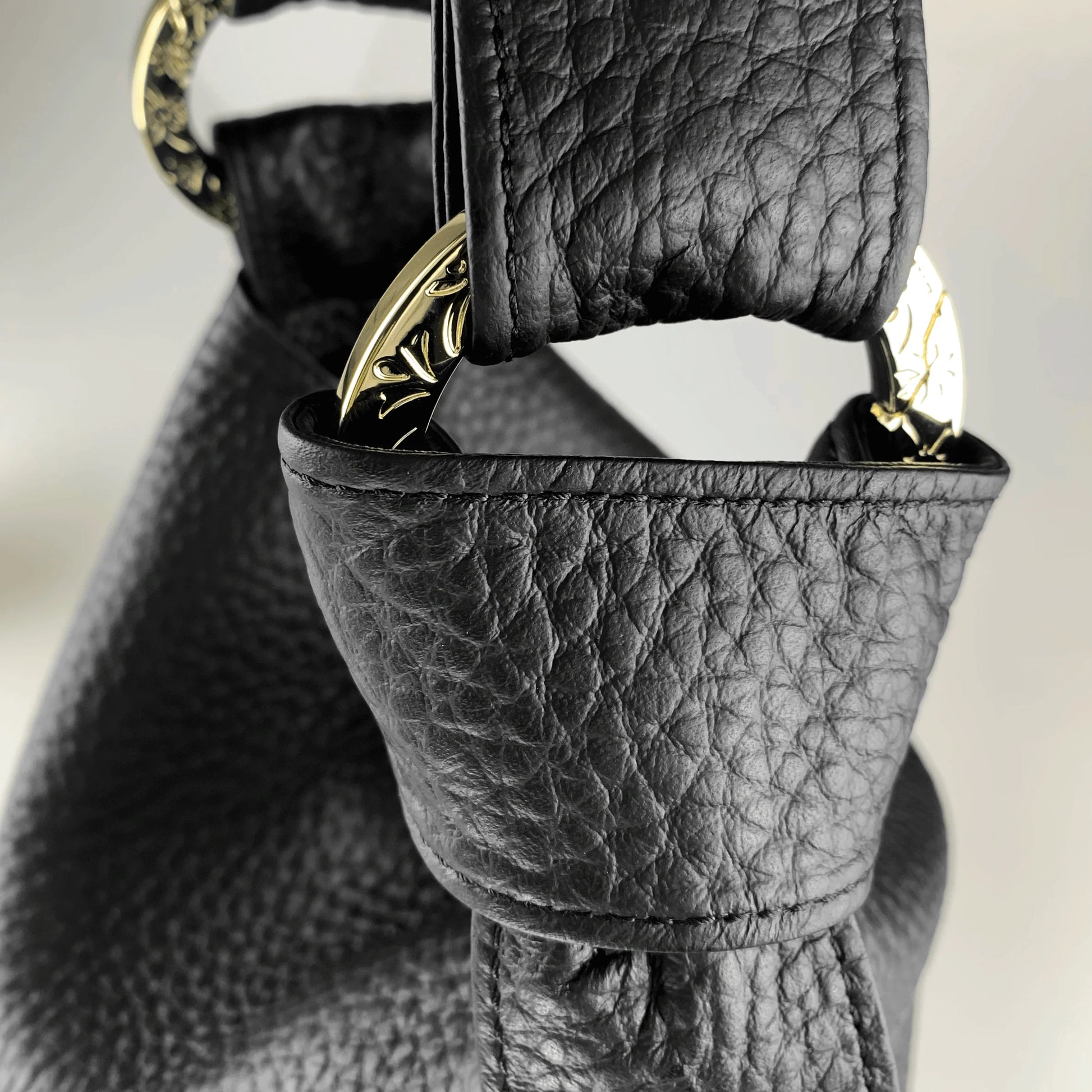La borsa BEA è l’accessorio ideale per un look casual chic, capace di unire design contemporaneo e dettagli artigianali. Realizzata in morbida pelle dollaro a grana grossa, doppiata per garantire struttura e leggerezza, si distingue per l’originale manico con nodo regolabile, agganciato tramite due moschettoni tondi personalizzati Jadise, impreziositi da incisioni ispirate ai tradizionali ghirigori siciliani.