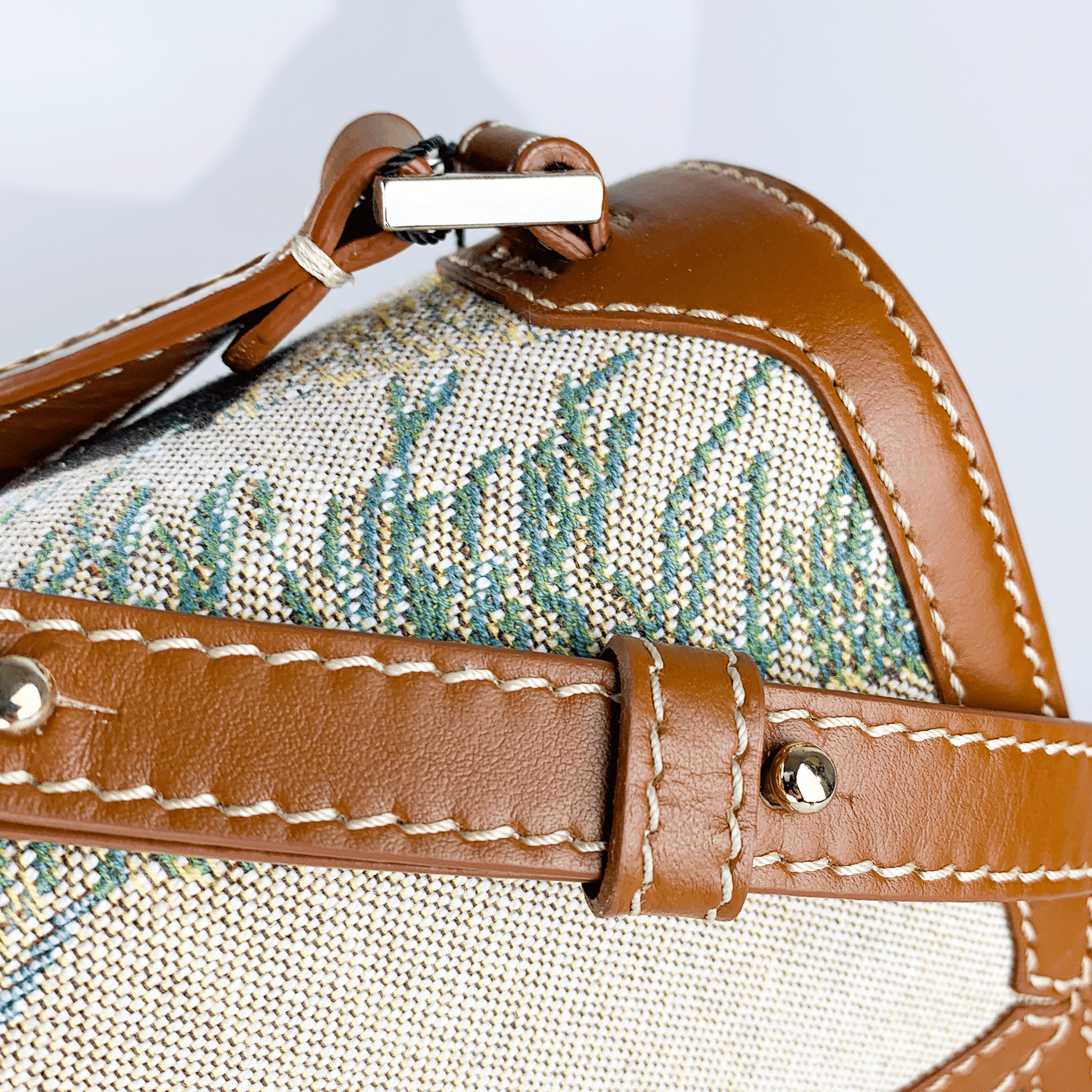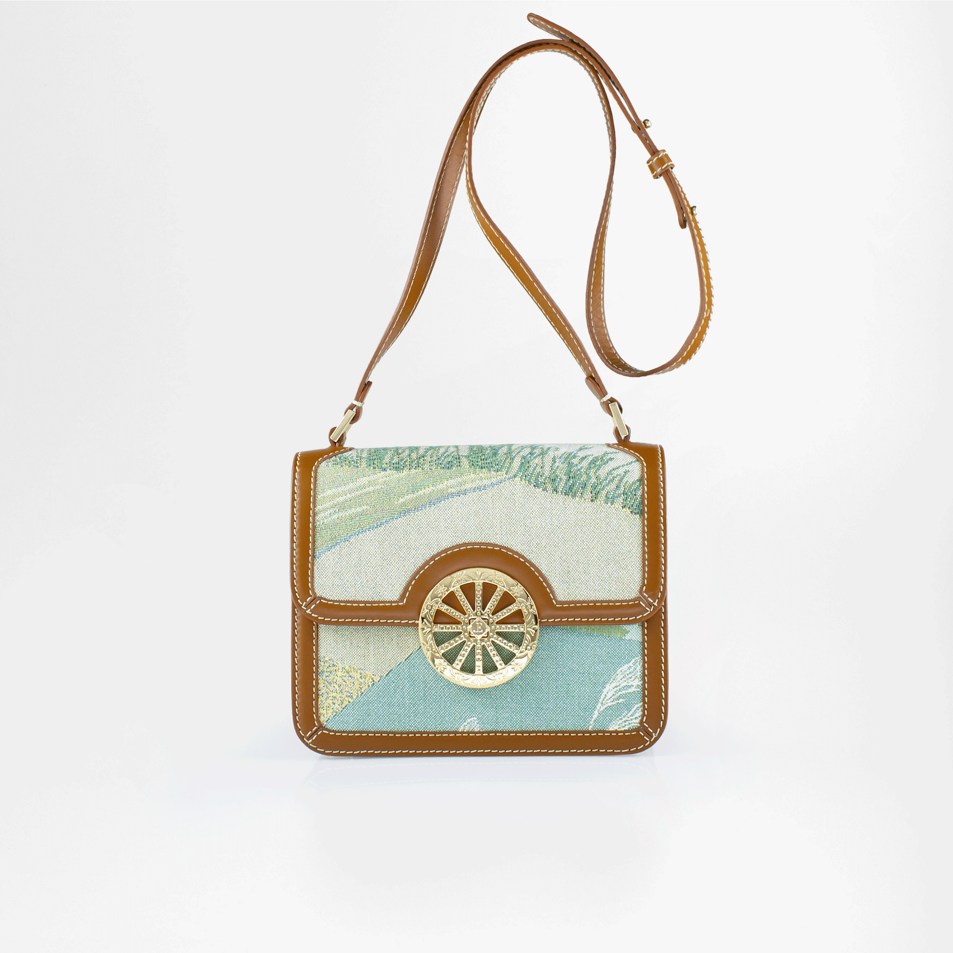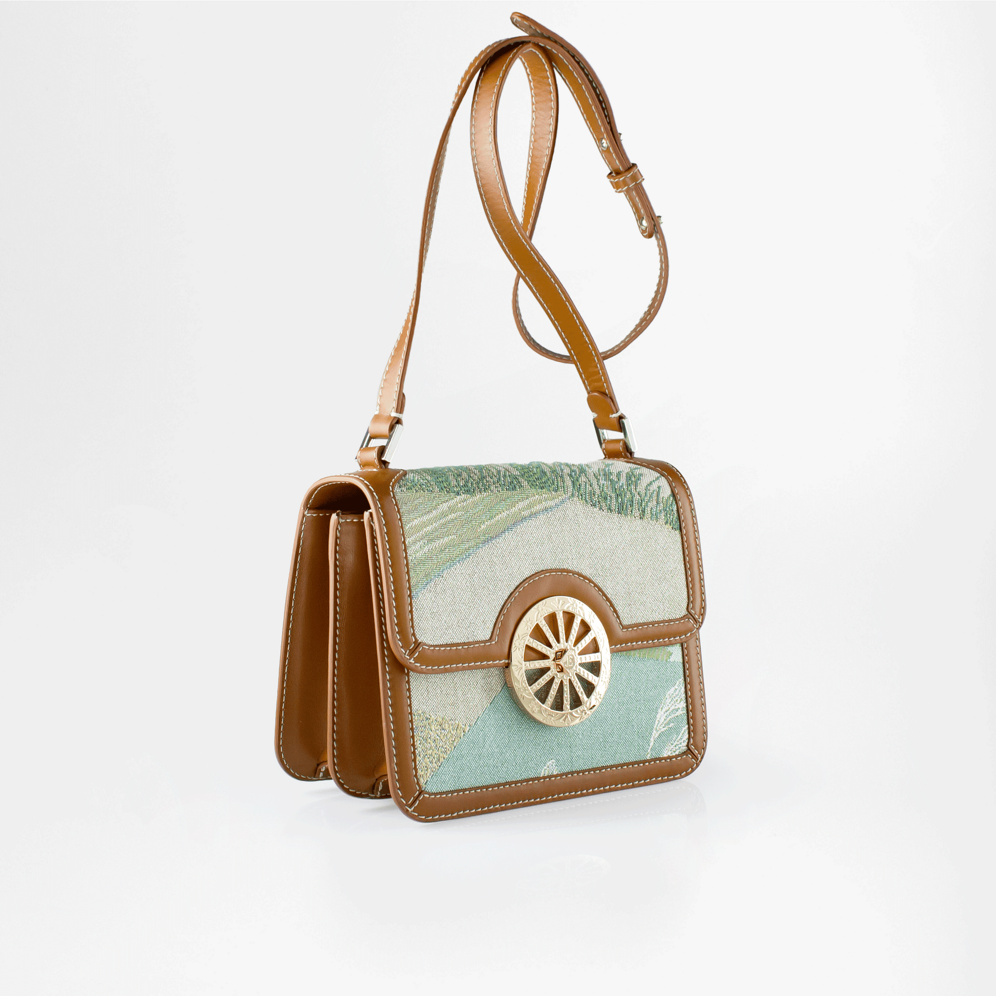 La borsa JESSICA MAQUIS, ispirata alla tecnica artistica dell'arazzo, unisce l'artigianato alla creatività. L'erbario selvaggio e lussureggiante che decora questa borsa è un omaggio alla terra siciliana, realizzata in mix di vera pelle e tessuto jacquard, presenta una esclusiva chiusura girello iconica Jadise a ruota di carretto siciliano. All'interno, due ampi scomparti divisi da una tasca centrale con chiusura zip e tasca portatutto a parete, mentre gli accessori metallici hanno una elegante finitura oro chiaro.