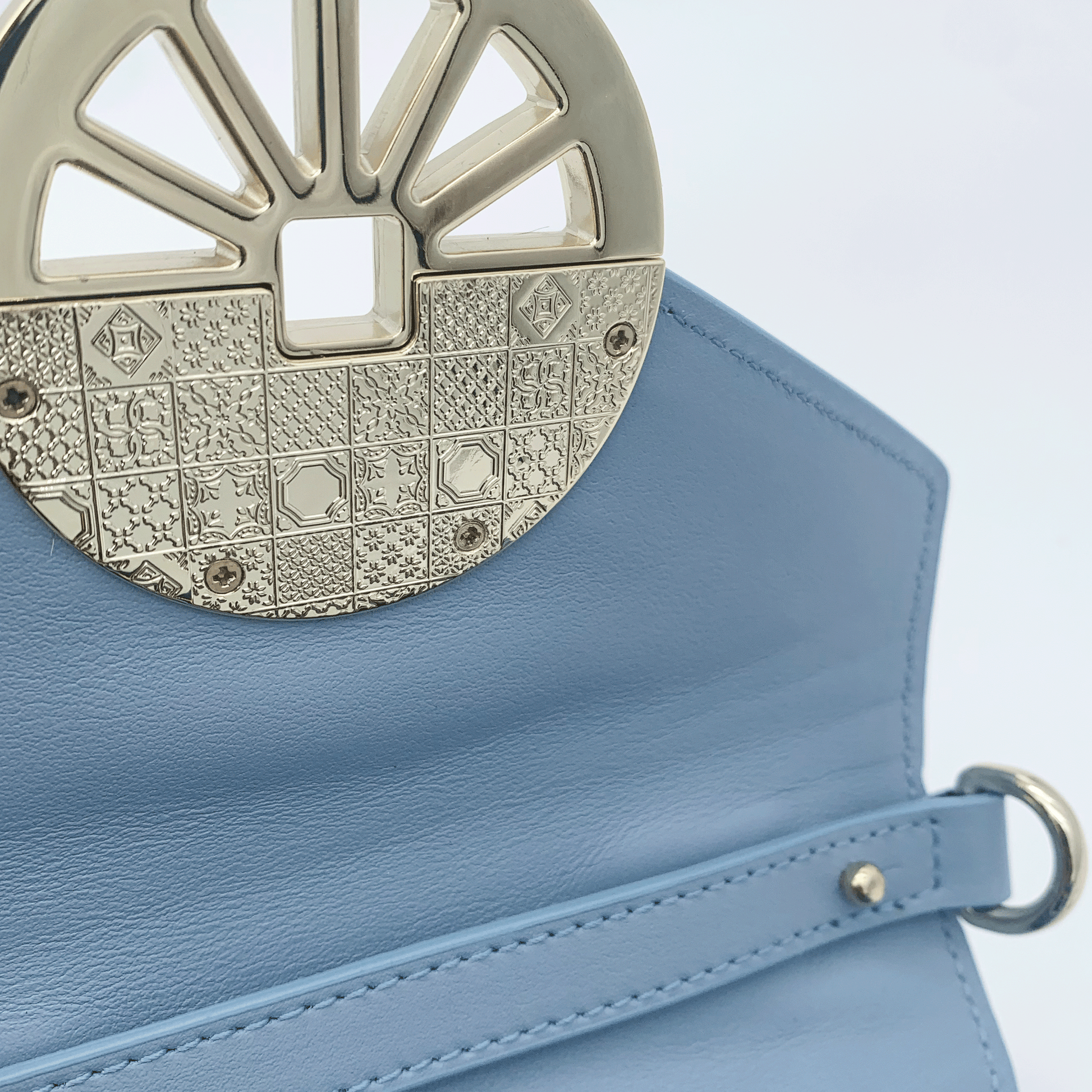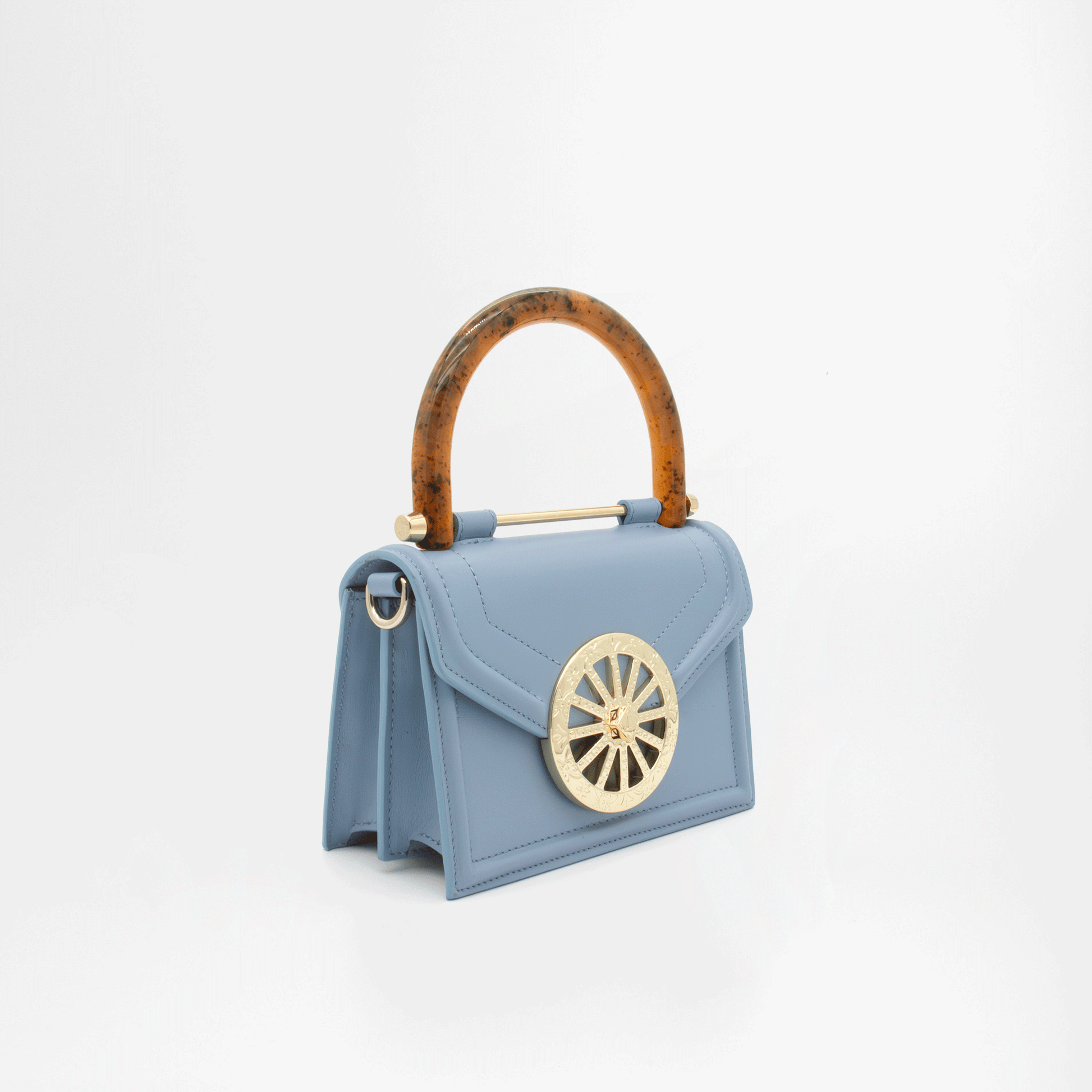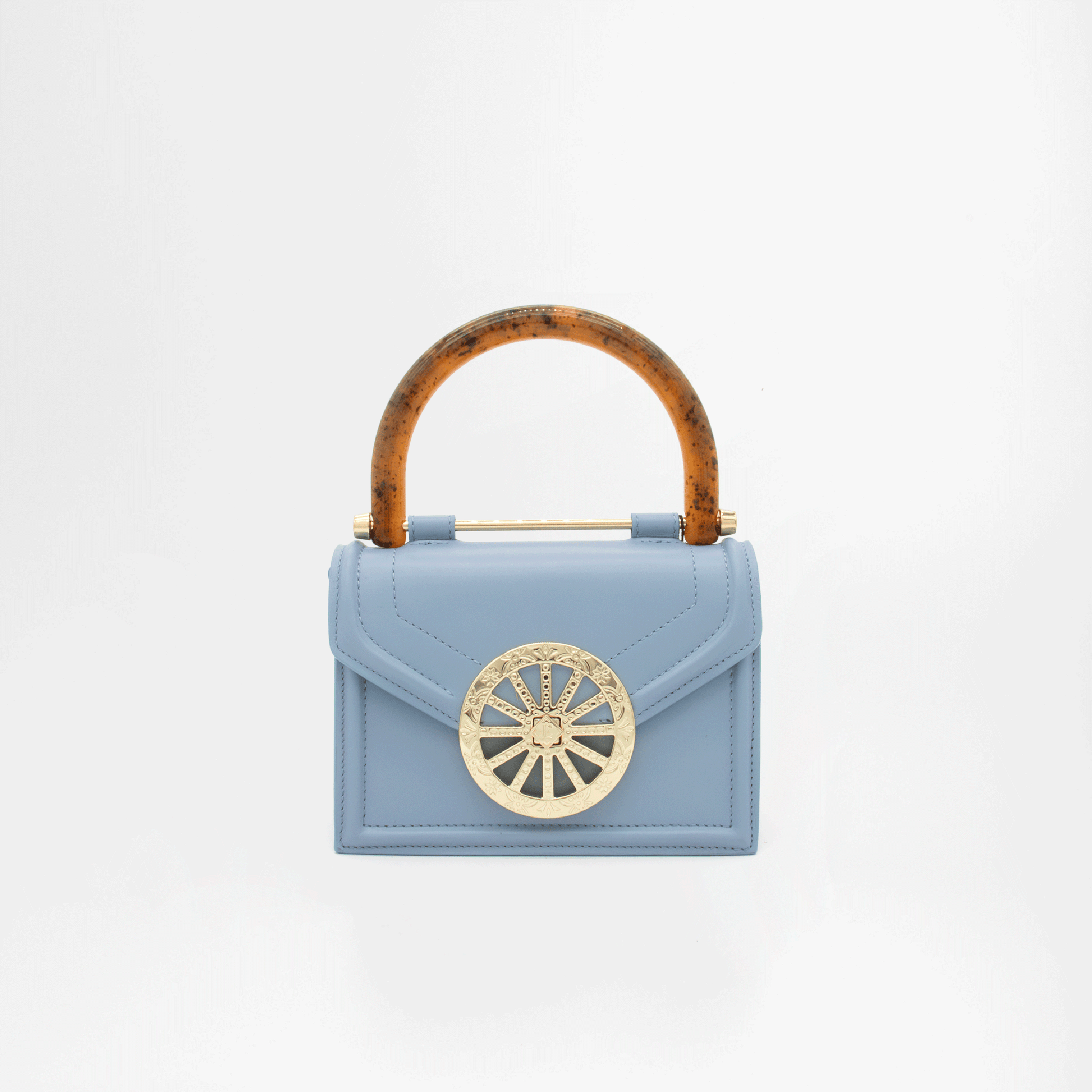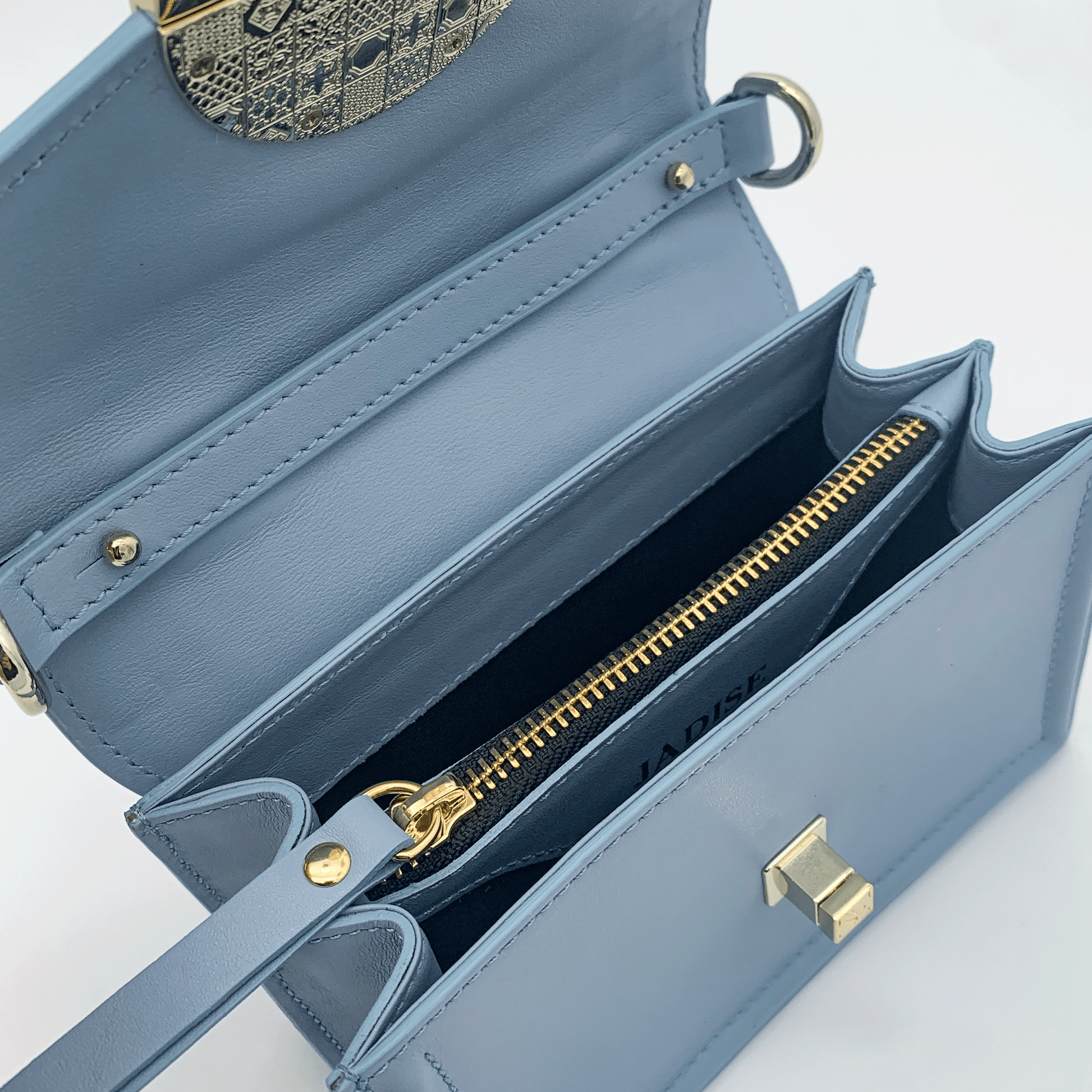 Un piccolo capolavoro dallo spirito deciso e femminile, la mini bag Lily Glamour conquista al primo sguardo. Realizzata a mano in morbida pelle nappa liscia, si distingue per le decorazioni in rilievo sui pannelli, il raffinato manico ad arco in acrilico tartarugato e l’esclusiva chiusura girello a forma di ruota di carretto siciliano, simbolo iconico del mondo Jadise. Le borchie decorative richiamano le tradizionali maioliche siciliane, esaltando l’anima artigianale e identitaria della borsa.