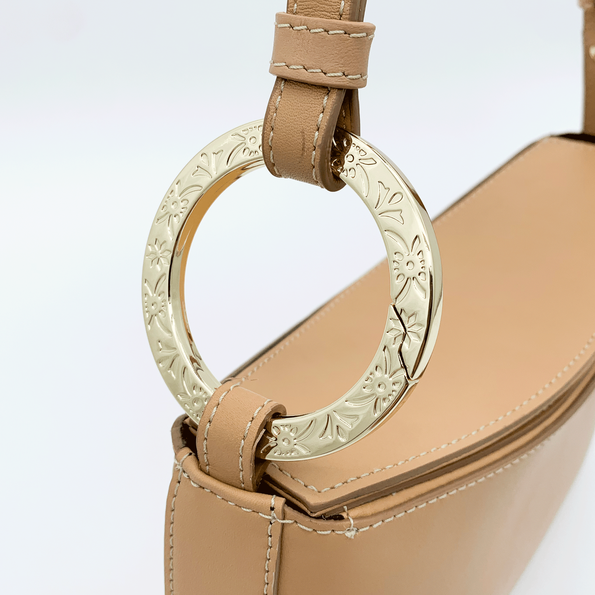 La tracolla regolabile è valorizzata da un elegante moschettone ad anello inciso con i caratteristici ghirigori siciliani, simbolo iconico del mondo Jadise.