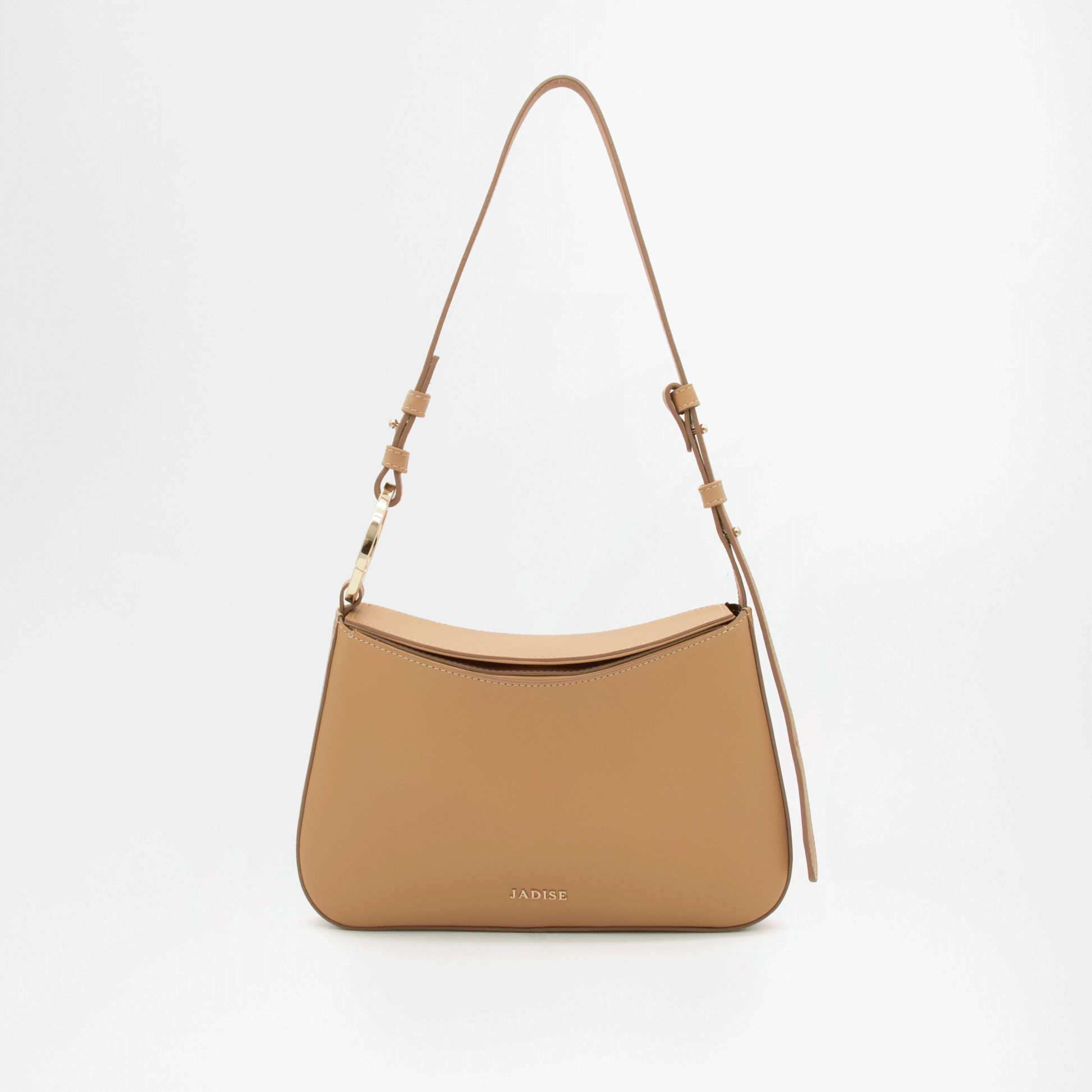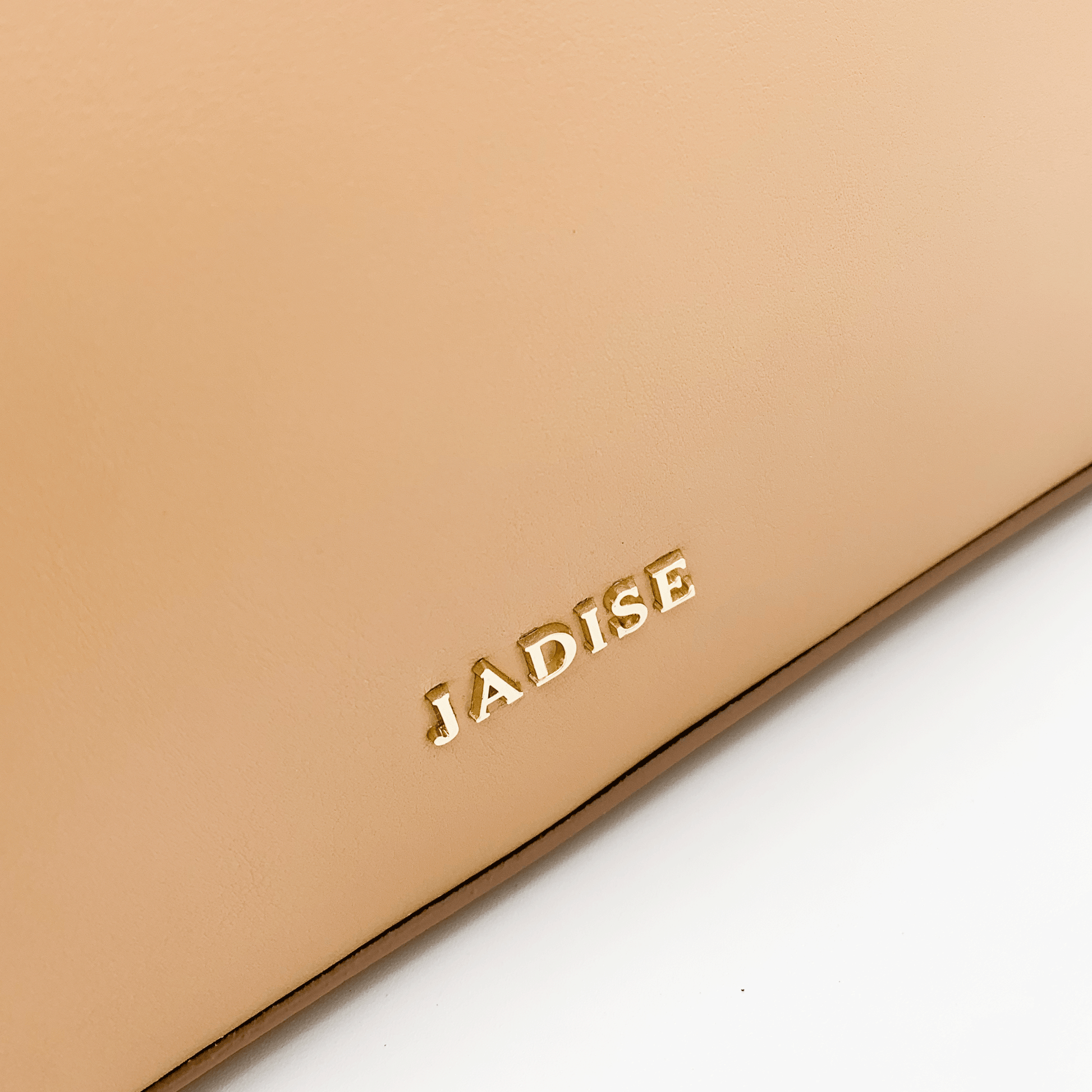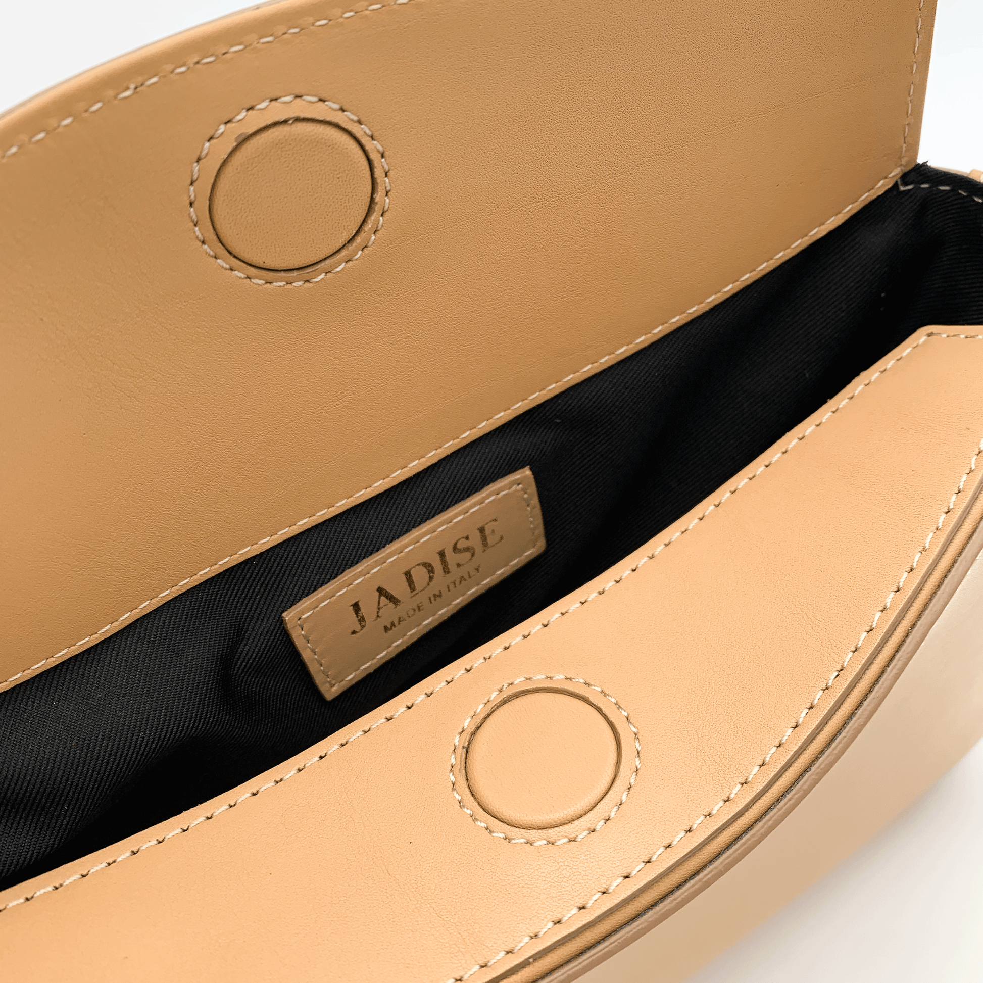 L’interno, a scomparto unico, è rifinito con cura in pelle e logato Jadise, mentre gli accessori metallici presentano una sofisticata finitura oro chiaro, per un tocco di luce senza tempo.