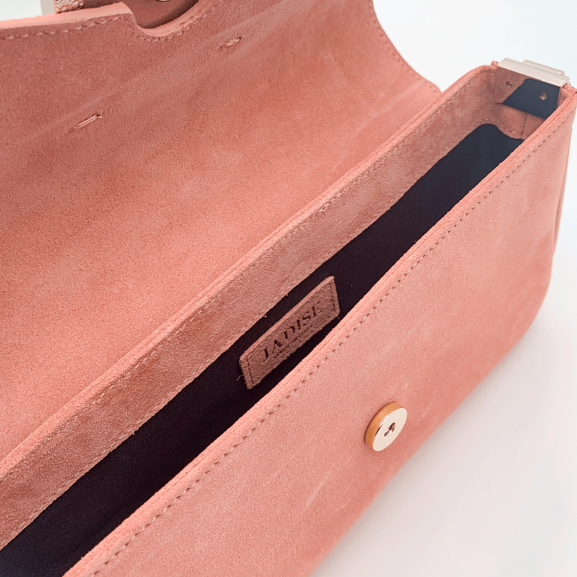 L’interno, ampio e ben rifinito, è in pelle con logo Jadise impresso e presenta un mono scomparto pensato per contenere l’essenziale con stile. Gli accessori metallici sono rifiniti in una calda tonalità oro chiaro, discreta e luminos.