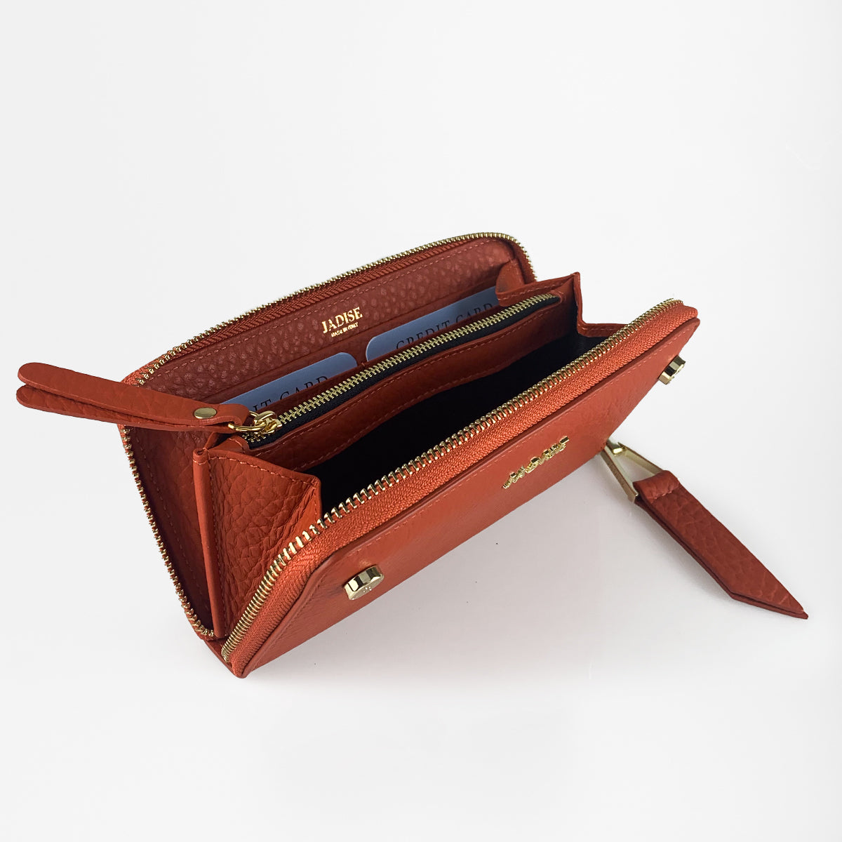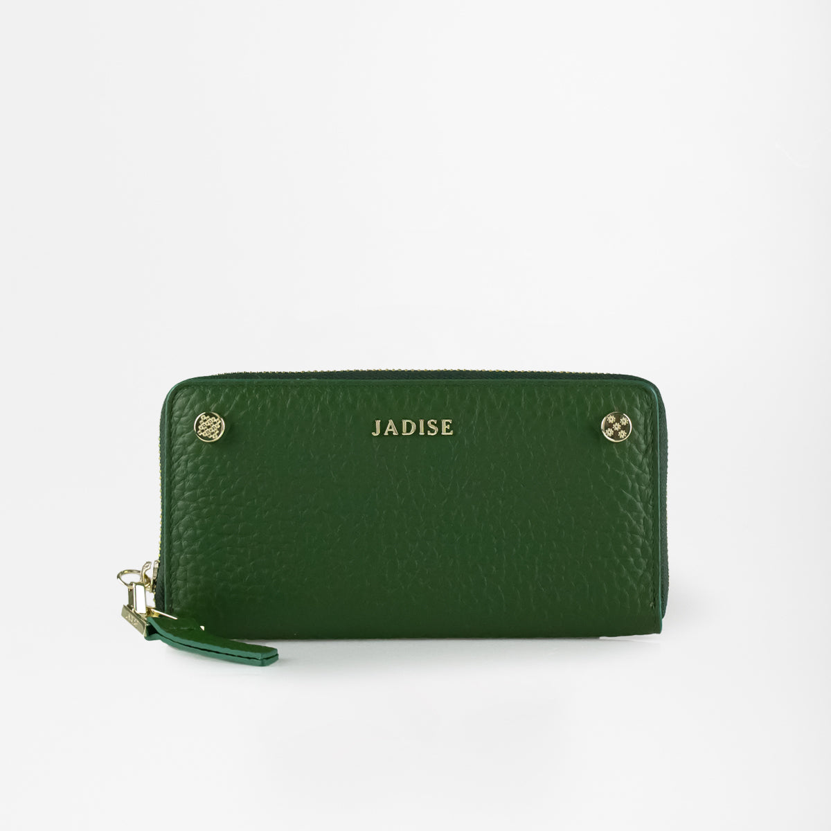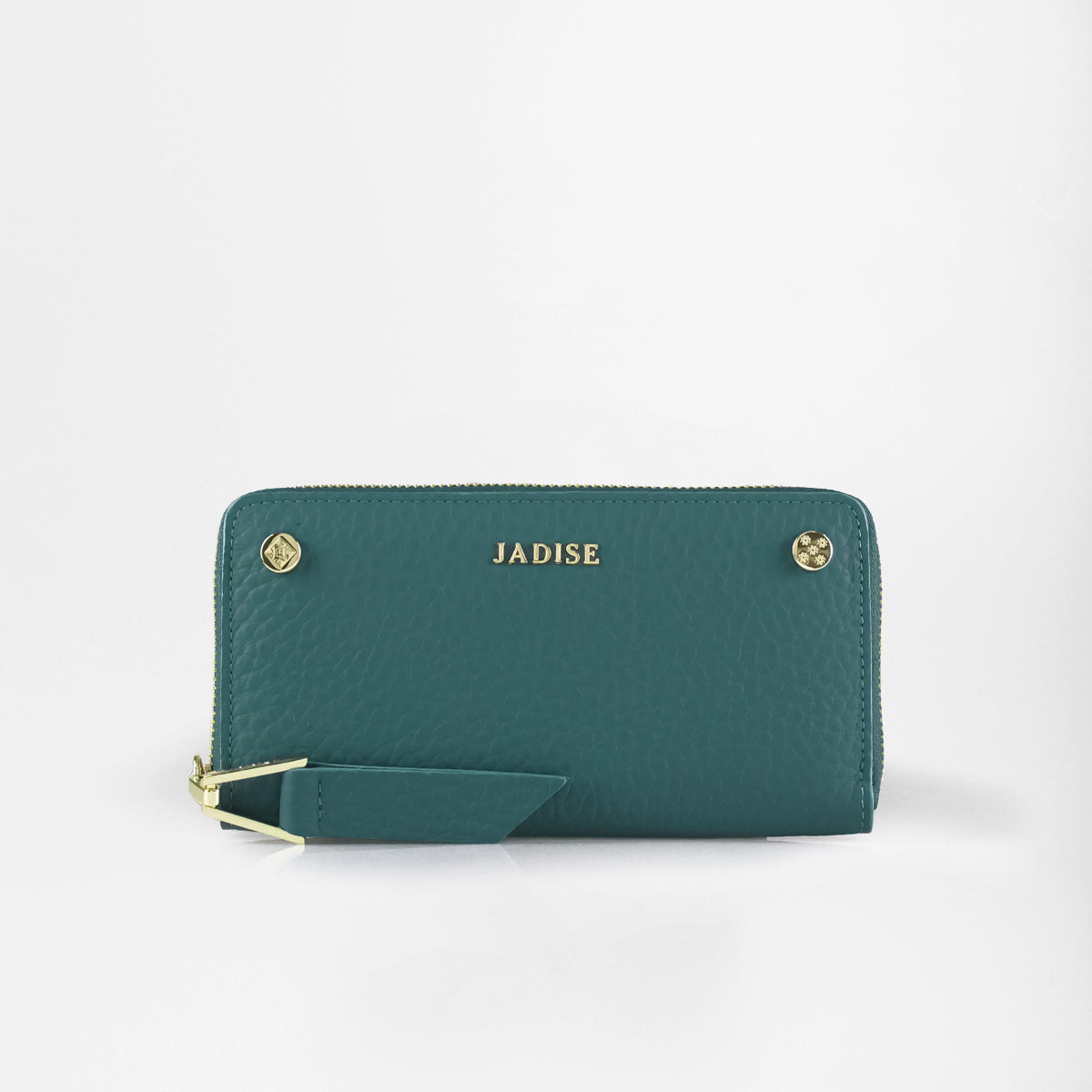 Portafoglio Jadise Studs comodo e capiente, realizzato in pelle dollaro grana grossa morbida al tatto, decorato con borchie iconiche Jadise con incise le maioliche siciliane e logo Jadise. Chiusura zip around con tirate in pelle lungo ed accessorio longato Jadise, all'interno troviamo otto scomparti per carte di credito, due scomparti per banconote, due tasche interne laterali, tasca centrale zip portamonete.